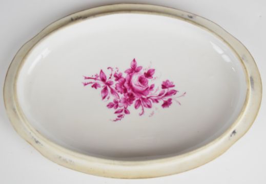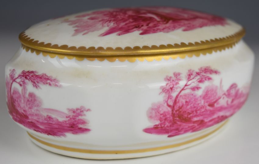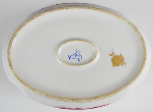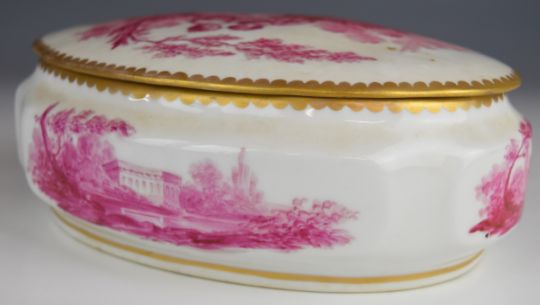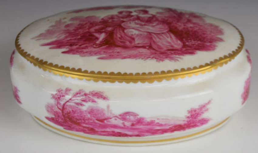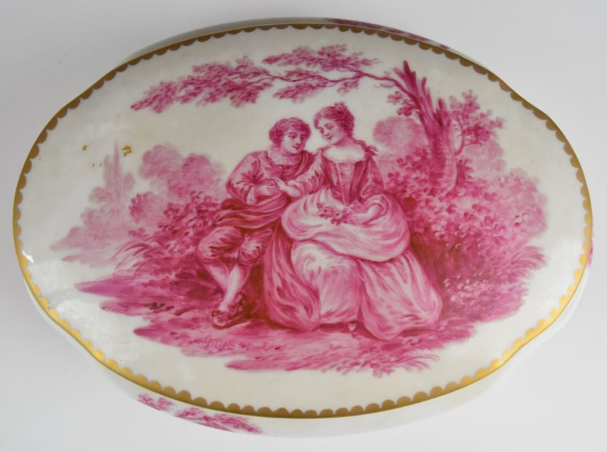 19th/20thC French porcelain covered oval box decorated with Watteau scenes and Sèvres mark to base, W21 x D15 x H9cm