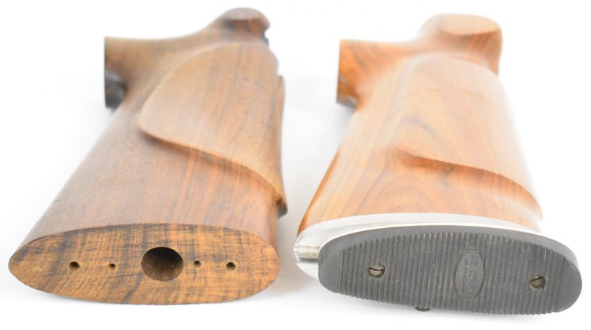 Two BSA Martini International rifle stocks, both with semi-pistol grips, one with adjustable butt plate.