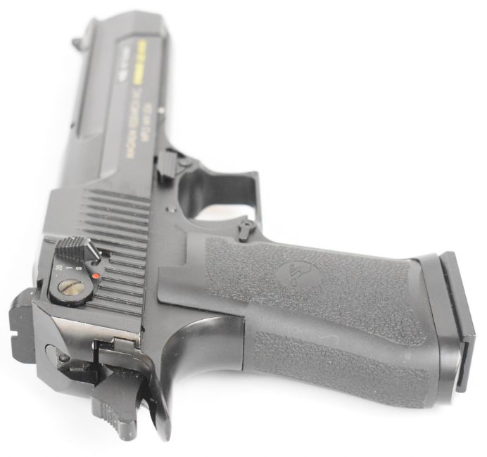 Cybergun Magnum Research Desert Eagle 6mm COairsoft pistol with textured grips, multi-shot magazine and fixed sights, serial number 22514689, in original box with instructions. PLEASE NOTE IF YOU REQUIRE POSTAGE ALL POST 1939 AIR GUNS CAN ONLY BE SENT TO AN RFD.