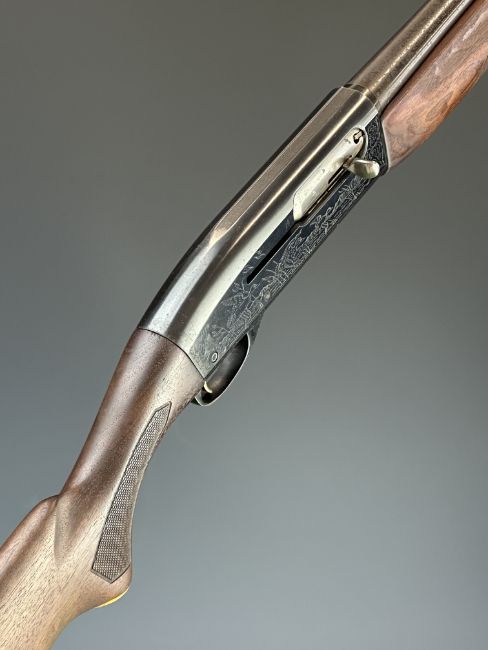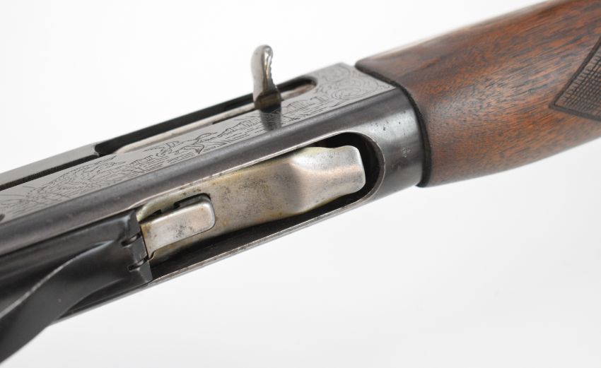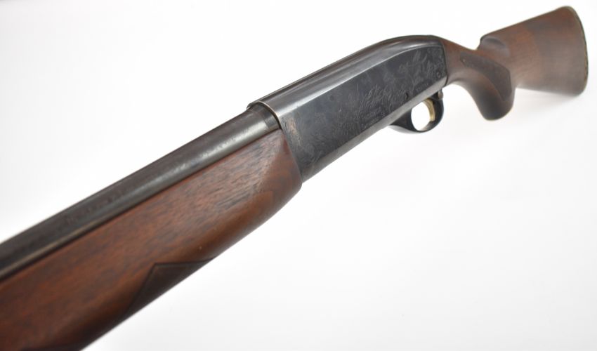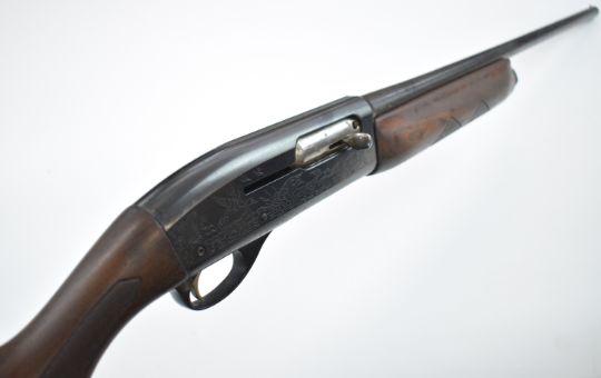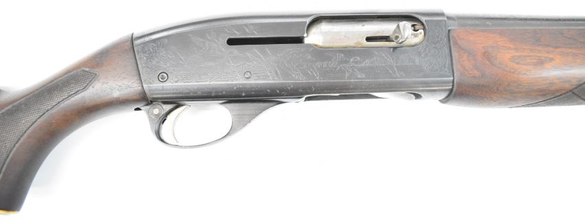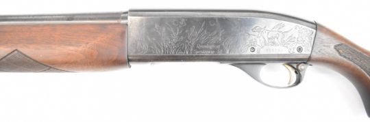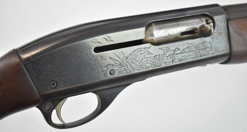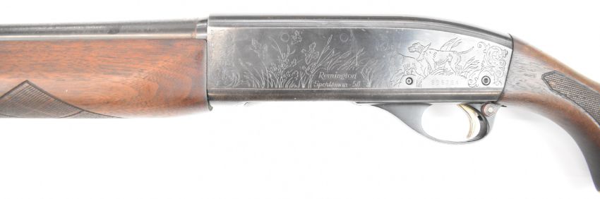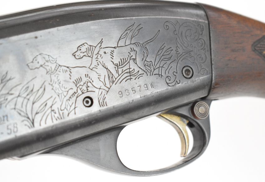 Remington Sportsman 58 16 bore 5-shot semi-automatic FAC shotgun with engraved scenes of dogs and birds to the action, chequered semi-pistol grip and forend and 28 inch barrel, overall length 124cm, length of pull 36.5cm, serial number 93579W. PLEASE NOTE THAT A VALID RELEVANT FIREARMS CERTIFICATE IS REQUIRED TO VIEW OR PURCHASE THIS LOT AND FOR ALL SHOTGUNS OR RIFLES PLEASE ENSURE YOU HAVE THE RELEVANT CERTIFICATE BEFORE BIDDING.