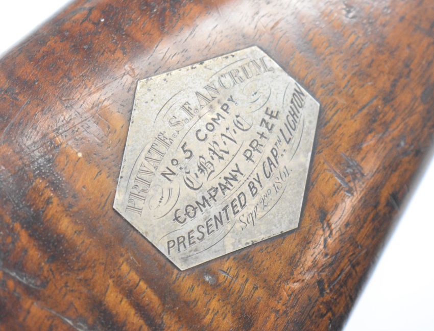 London Armoury Company Enfield three band percussion hammer action rifle with lock stamped with crown over 'VR' cypher and '1861 L.A.Co', adjustable ladder sights, brass trigger guard, butt plate and mounts, steel ram-rod, leather sling, hexagonal plaque inset to the stock engraved 'Private S F Ancrum No. 5 Compy E.B.R.V.C. Company Prize Presented by Captn Lighton Seot 2nd 1861', associated bayonet and 39 inch rifled barrel, overall length excluding bayonet 140cm.