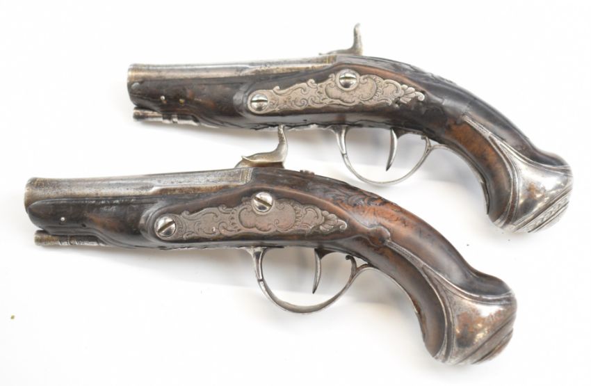 A pair of Queen Anne percussion converted from flintlock coat pistols, each with engraved and indistinctly named lock, hammer, trigger guard, top strap and mounts, carved decoration to the wrist, steel tipped wooden ram-rod and 3.5 inch gold decorated smooth bored barrel, overall length 19cm, in fitted mahogany case with cylindrical brass powder flask, oil, bottle, bullet mould etc.
