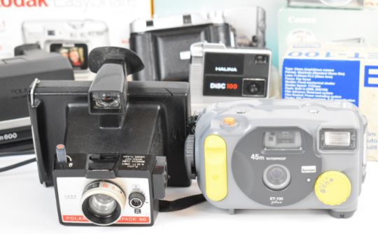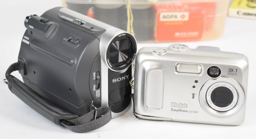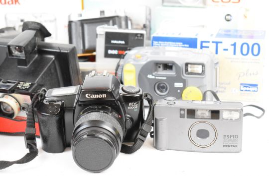 Cameras to include Canon EOS 1000F N 35mm SLR camera with Canon EF 35-80mm 1:4-5.6 lens, Canon Ixus 800IS and 220HS digital cameras, Kodak EasyShare CX7330 digital camera, Polaroid Sun 600 and Colourpack 80 cameras, Pentax ESPIO compact 35mm camera, Balda folding camera, Sony Handycam DCR-HC37E camcorder and an Epoque ET-100 underwater camera, many in original boxes or with instructions