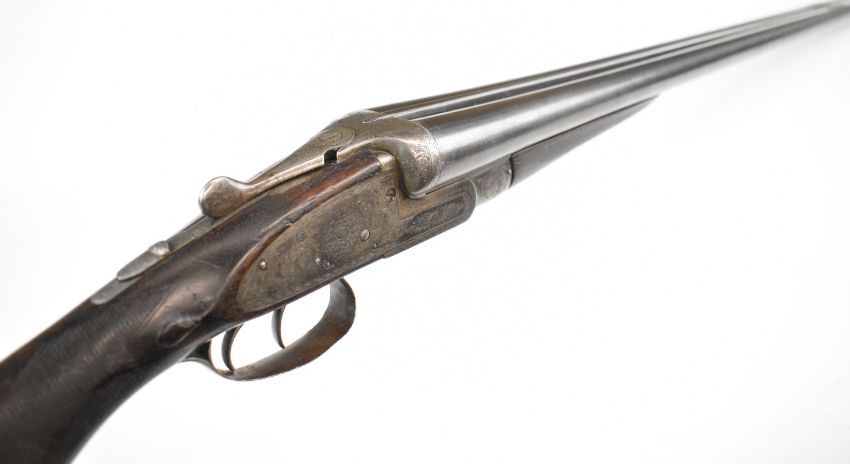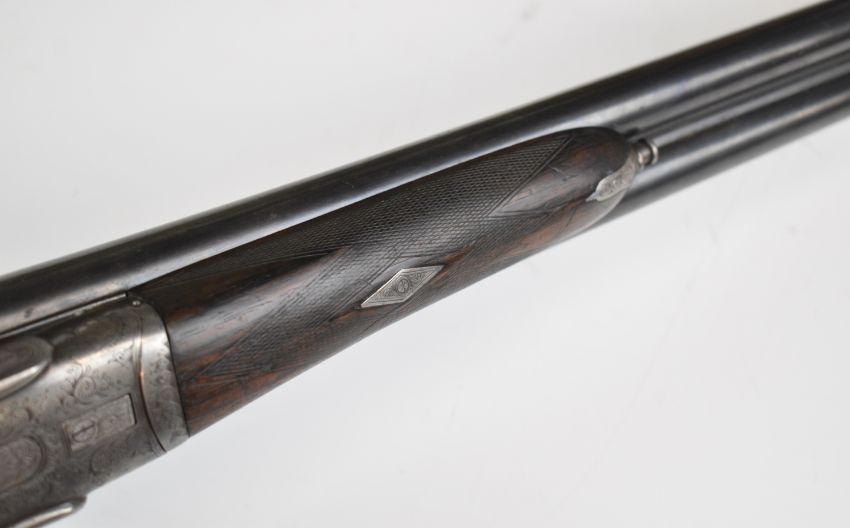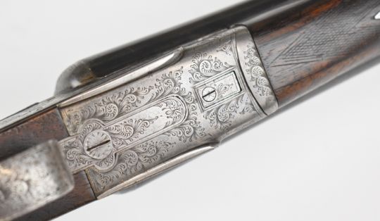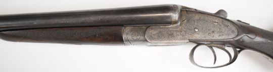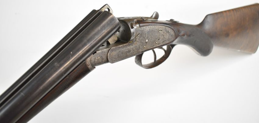 Midland 12 bore side by side ejector shotgun with engraved sidelock plates, trigger guard, underside, top plate, thumb lever and fences, chequered semi-pistol grip and forend, carved teardrop to the wrist, vacant cartouche to the underside of the stock, double trigger and named 28 inch barrels choked ¾ and cylinder, overall length 113cm, length of pull 35.5cm, serial number 22425. PLEASE NOTE THAT A VALID RELEVANT SHOTGUN CERTIFICATE IS REQUIRED TO VIEW OR PURCHASE THIS LOT AND FOR ALL SHOTGUNS OR RIFLES PLEASE ENSURE YOU HAVE THE RELEVANT CERTIFICATE BEFORE BIDDING.