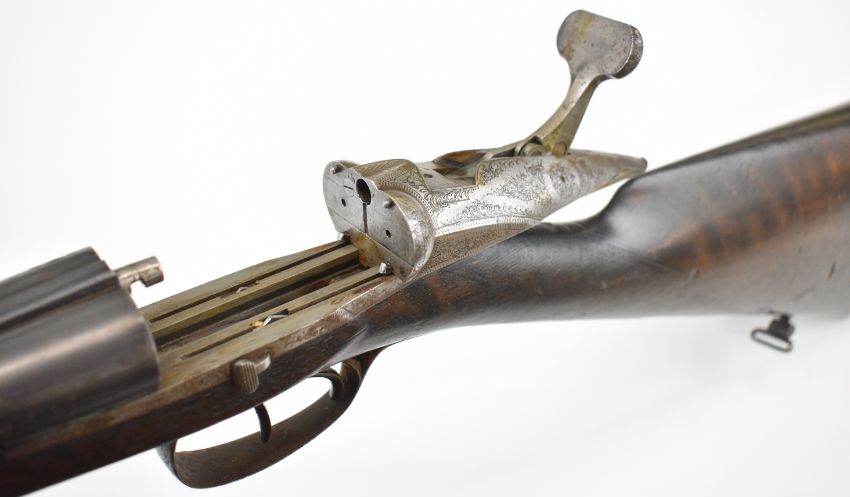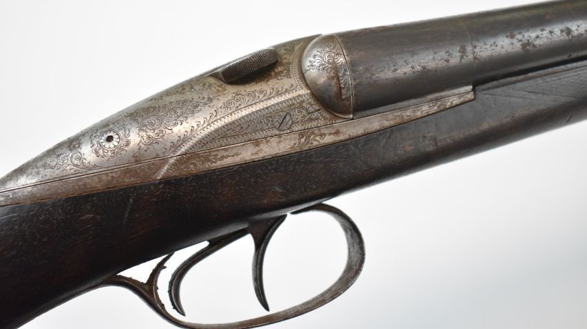 Darne 16 bore side by side shotgun with engraved sliding action, chequered grip and forend, sling mounts, double trigger and 27 inch barrels, overall length 108.5cm, length of pull 36cm, serial number 917. PLEASE NOTE THAT A VALID RELEVANT SHOTGUN CERTIFICATE IS REQUIRED TO VIEW OR PURCHASE THIS LOT AND FOR ALL SHOTGUNS OR RIFLES PLEASE ENSURE YOU HAVE THE RELEVANT CERTIFICATE BEFORE BIDDING.