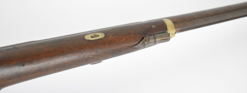 Henry Hitchin 12 bore muzzle loading percussion hammer action sporting gun with named and engraved lock, engraved hammer, trigger guard, top plate and mounts, chequered grip, vacant wrist cartouche and 33 inch smooth bored multi-stage Damascus barrel, overall length 123.5cm