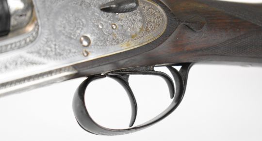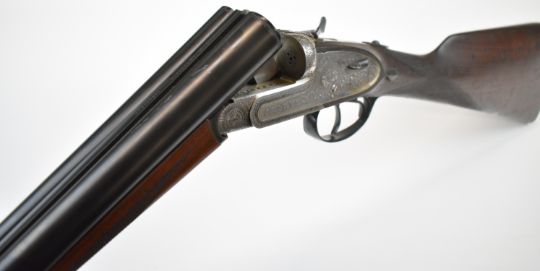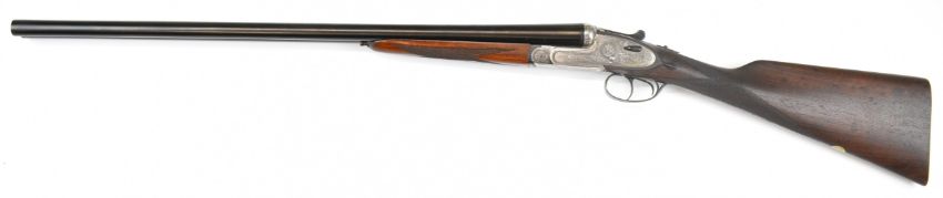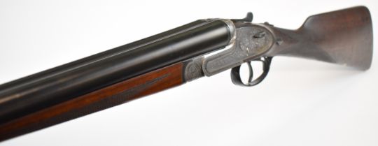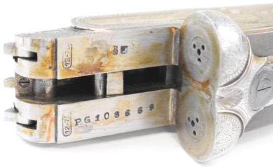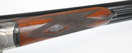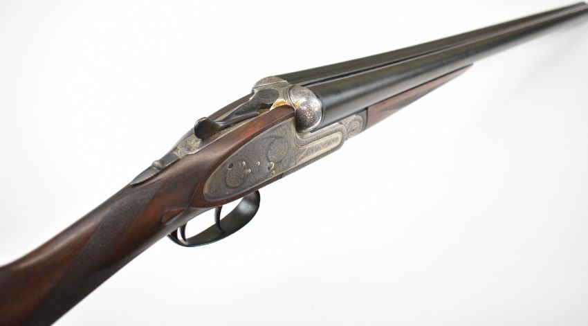 Gorosabel Blackpoint De Luxe 12 bore sidelock side by side ejector shotgun with floral and scroll engraving to the hand-detachable locks, underside, trigger guard, top plate, thumb lever and fences, chequered grip and forend, carved teardrop to the wrist, vacant cartouche to the underside of the stock, double trigger and named 27 inch barrels choked improved cylinder, overall length 111.5cm, length of pull 36.5cm, serial number 108669. PLEASE NOTE THAT A VALID RELEVANT SHOTGUN CERTIFICATE IS REQUIRED TO VIEW OR PURCHASE THIS LOT AND FOR ALL SHOTGUNS OR RIFLES PLEASE ENSURE YOU HAVE THE RELEVANT CERTIFICATE BEFORE BIDDING.
