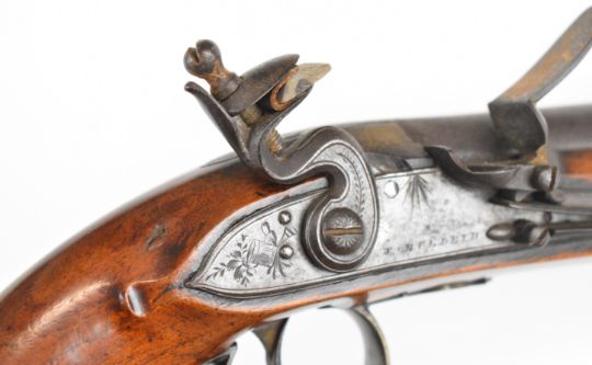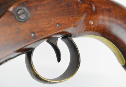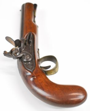John Bulleid of Bristol flintlock pistol with named and engraved lock, engraved hammer, top strap, brass trigger guard and mounts, horn-tipped wooden ram-rod and 8.5 inch smooth bored barrel, overall length 36.5cm.