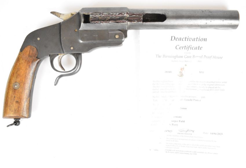 Deactivated German WW1 flare or signalling pistol with two part mahogany grip, push forward underlever, suspension loop and 9 inch part octagonal barrel stamped with proof marks, overall length 40cm, serial number 13260, with de-activation certificate dated 14/04/25.