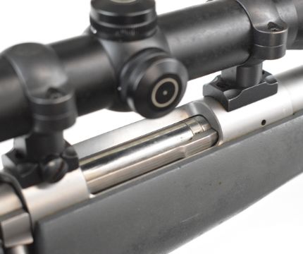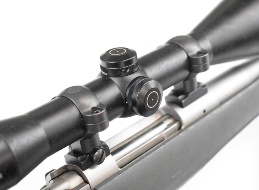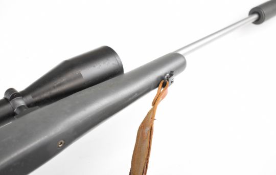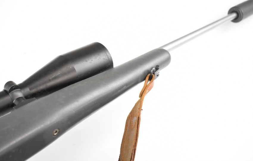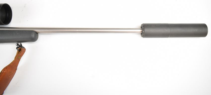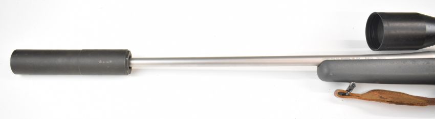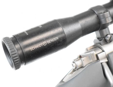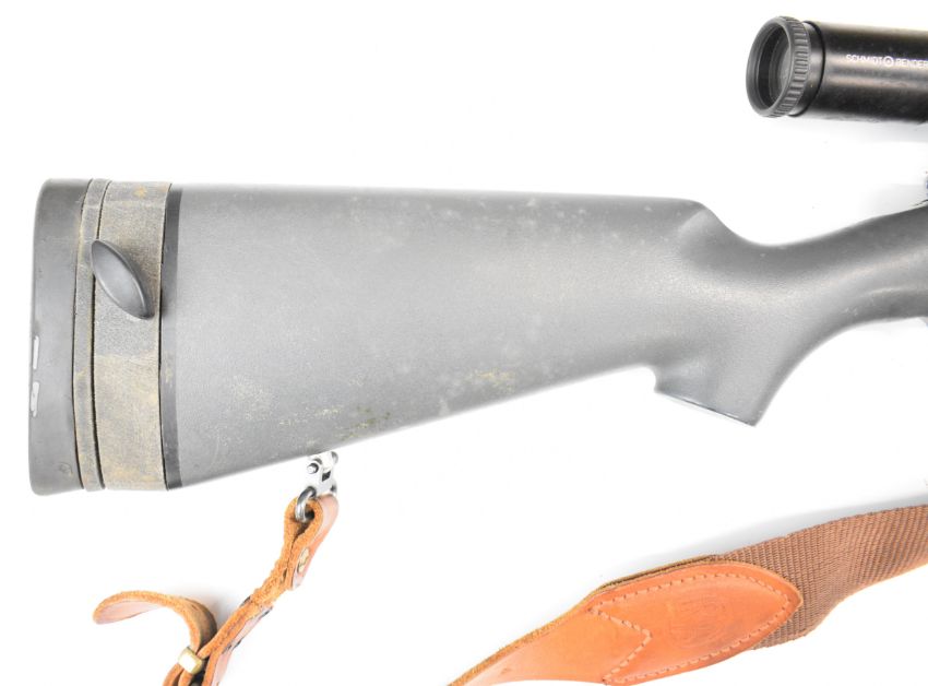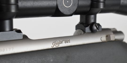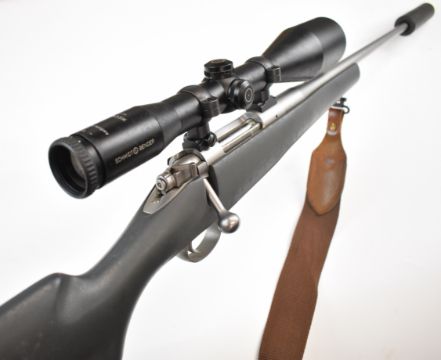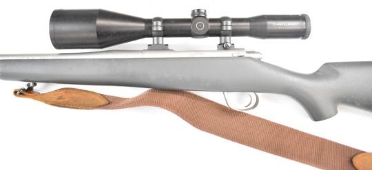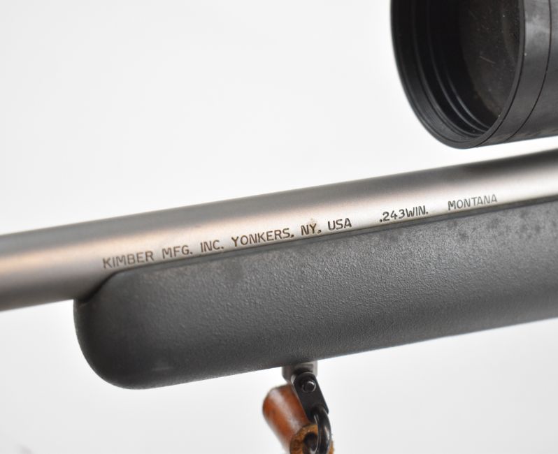 Kimber 84M .243 bolt-action rifle with composite stock, semi-pistol grip, RWS sling, Schmidt & Bender Klassic 8x56 scope, sound moderator and 29 inch barrel, overall length 123.5cm, serial number KM30177. PLEASE NOTE THAT A VALID RELEVANT FIREARMS CERTIFICATE IS REQUIRED TO VIEW OR PURCHASE THIS LOT AND FOR ALL SHOTGUNS OR RIFLES PLEASE ENSURE YOU HAVE THE RELEVANT CERTIFICATE BEFORE BIDDING.