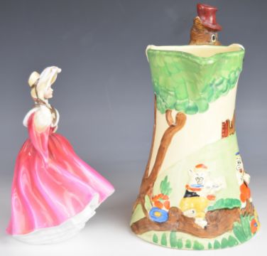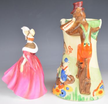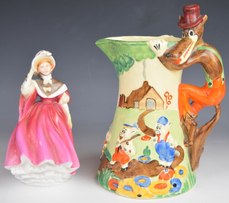 Wadeheath Art Deco nursery rhyme relief moulded Three Little Pigs jug with figural wolf handle and Royal Doulton figurine Sunday Morning, tallest 26cm