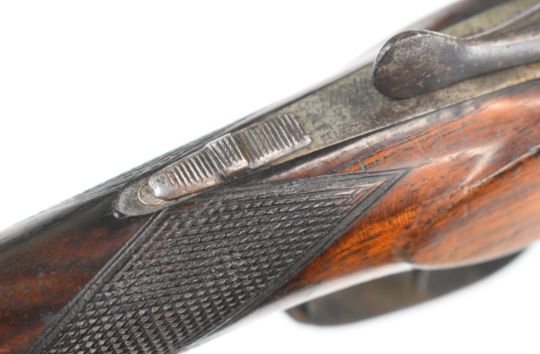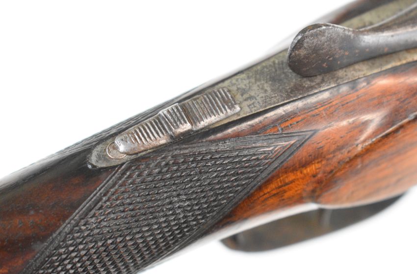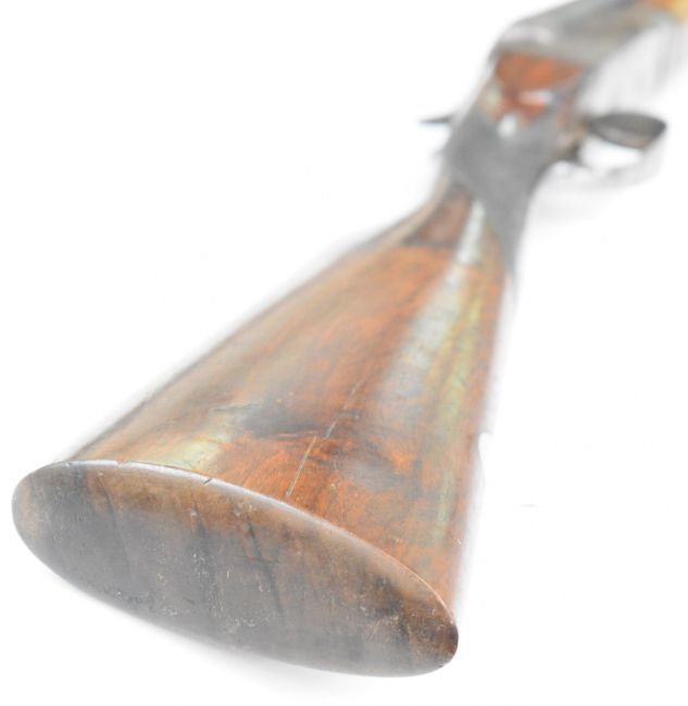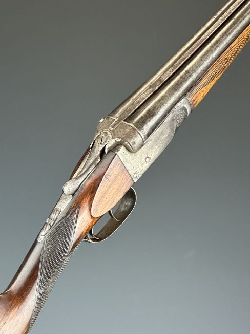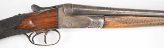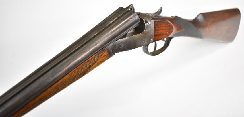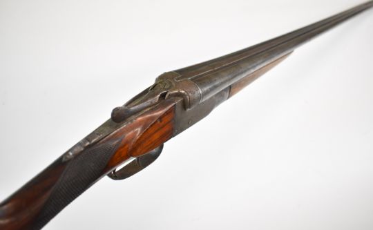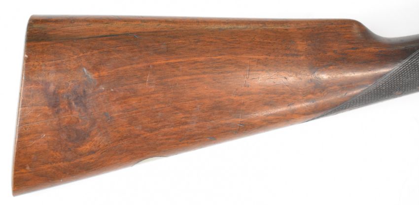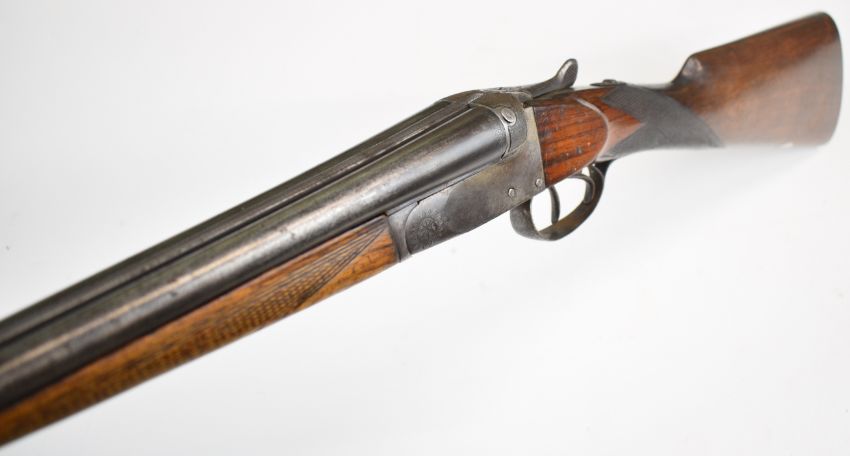 Belgian .410 side by side shotgun with chequered grip and forend, vacant cartouche to the underside of the stock, double trigger and 30 inch barrels, overall length 113.5cm, length of pull 32.5cm, serial number 111. PLEASE NOTE THAT A VALID RELEVANT SHOTGUN CERTIFICATE IS REQUIRED TO VIEW OR PURCHASE THIS LOT AND FOR ALL SHOTGUNS OR RIFLES PLEASE ENSURE YOU HAVE THE RELEVANT CERTIFICATE BEFORE BIDDING.