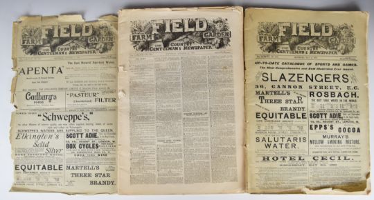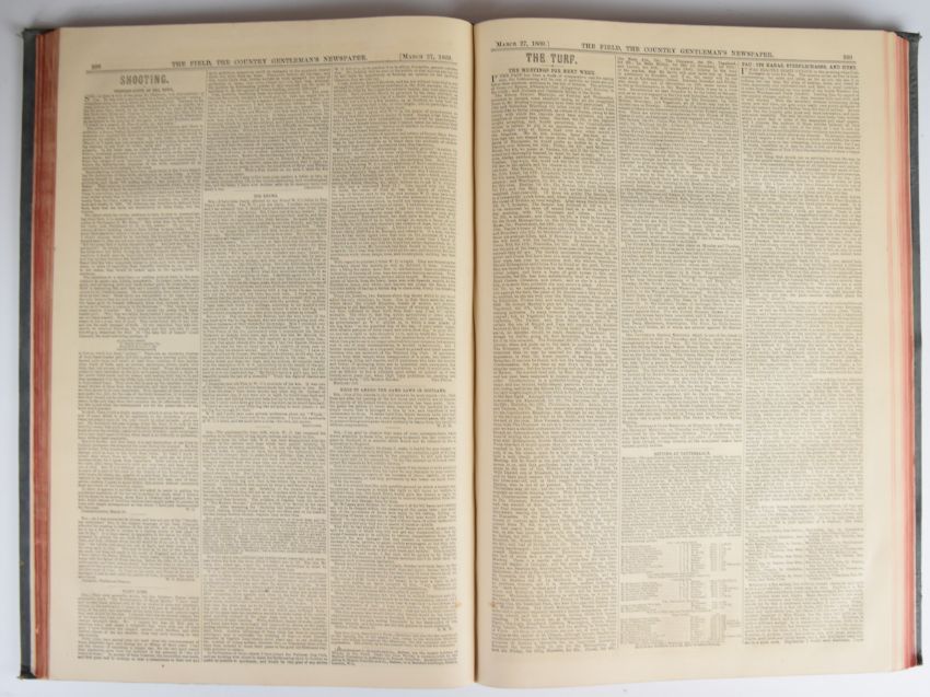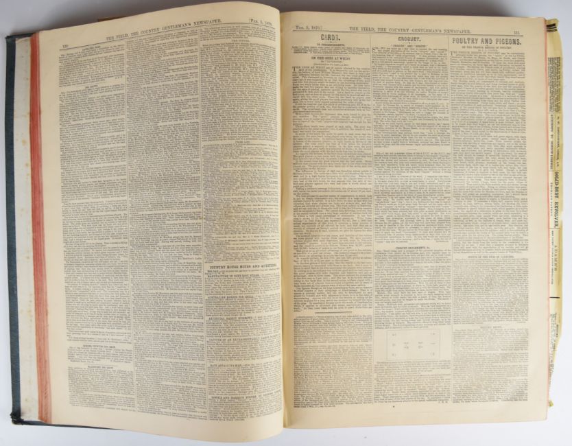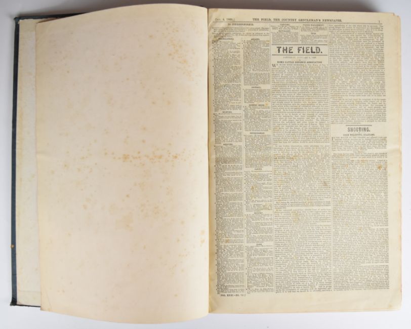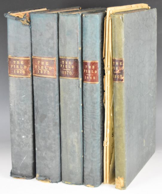 [Periodical] The Field, The Country Gentleman’s Magazine illustrated, group of five bound volumes comprising Jan-Oct 1868, Feb – June 1869, Jan – Dec 1870, Jan – Dec 1873 and Jan – Dec 1876 cloth bound folios with leather title labels and two issues for 1896 [An illustrated magazine focused on country life & field sports]