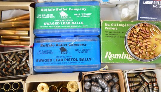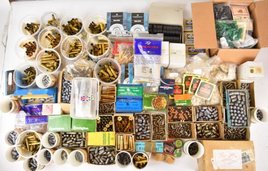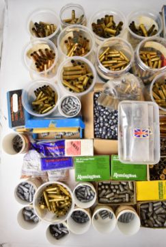 A very large collection of re-loading materials including empty brass cases, bullet heads, less balls, primers etc for calibres including .577, .323, .326, .512, .314, .307, .495, 8x60 R, .348 Winchester, .50-70 Government, 10.4x47 R, .43 Mauser, .43 Spanish, .30-30, 6mm Lee Navy, .45-70 Government, 8mm Mauser, .32-40, .308, .310 Cadet, .509, .50, .303 British, .30, .300, .505, .22, .457, .45, .308, .575, .36, .54, .45 ACP, 11x59, MMP Sabots Shoot Jacketed or Cast Pistol-Rifle muzzle loader bullets etc