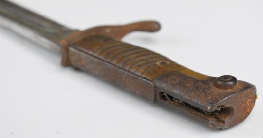 German Durkopp S 98/05 bayonet, with wooden grips, curved quillon and fullered blade with maker's name, in metal scabbard with leather frog, overall length 52cm. PLEASE NOTE: WE ARE NOT ABLE TO OFFER OUR USUAL POSTAGE SERVICE FOR THIS LOT