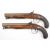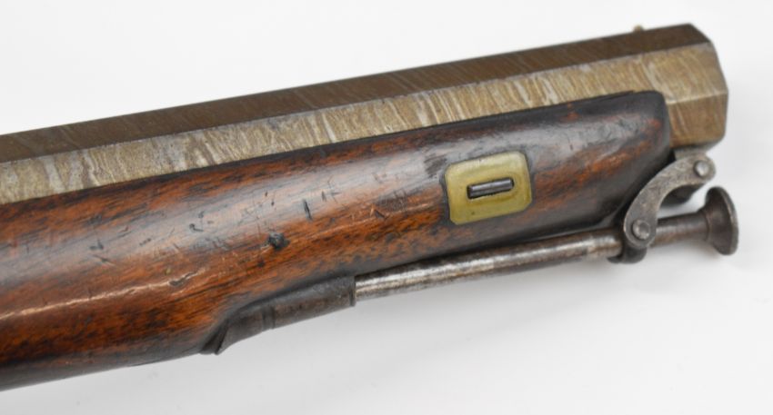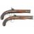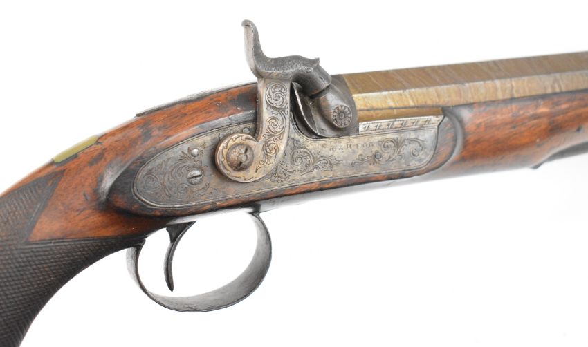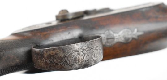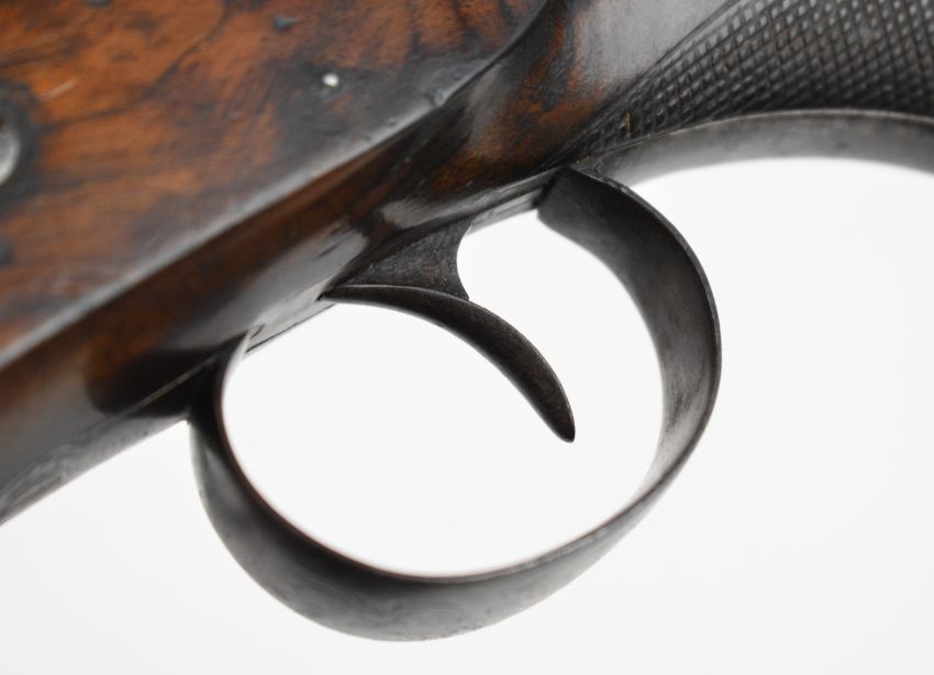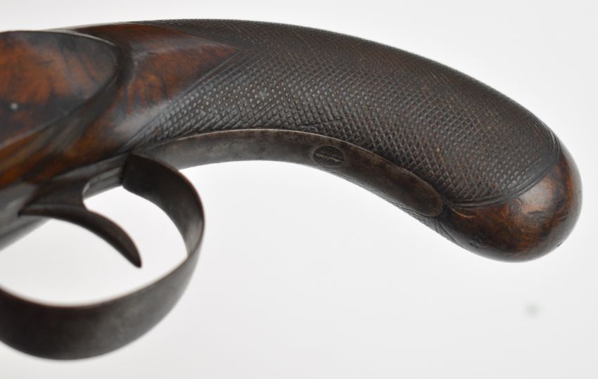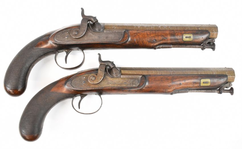 A pair of Charles & Henry Egg 18 bore percussion hammer action duelling pistols each with engraved lock signed 'C&G Egg', engraved stylised dolphin hammer, trigger guard and top plate, chequered grip, vacant wrist cartouche, captive ram-rod and 8 inch smooth bored octagonal Damascus barrel, overall length 36cm, in fitted wooden case with powder flask.