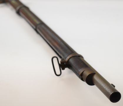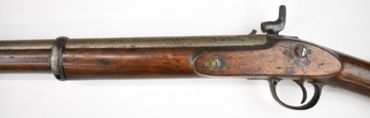 Enfield P53 3-band percussion hammer action musket with brass trigger guard, butt plate stamped 'V K2 23 40', sling suspension mounts and 39 inch rifled barrel, overall length 139.5cm