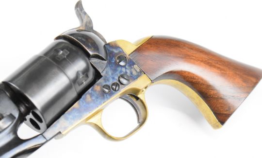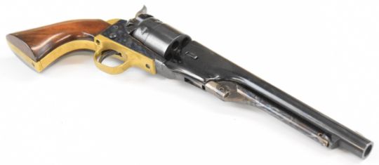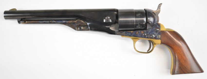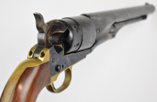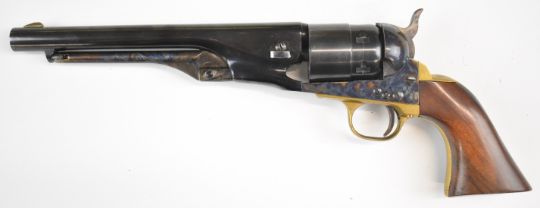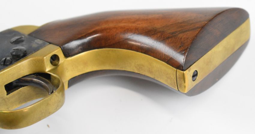 Colt style .36 six-shot single-action blank firing revolver with brass trigger guard and grip strap, wooden grips and 8 inch barrel, overall length 37cm, NVSN together with two brown leather holsters and matching belts.
