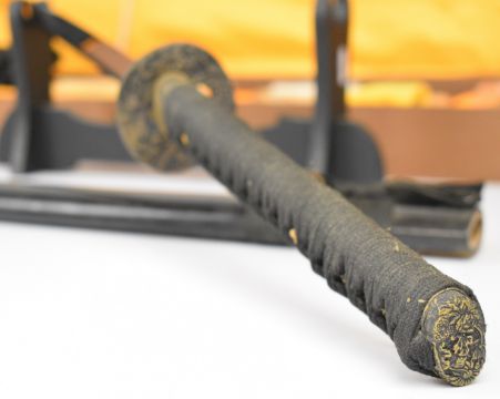 Japanese Samurai sword with bound grip, two menuki, decorated tsuba and 73cm blade, together with fitted case and stand. PLEASE NOTE: WE ARE NOT ABLE TO OFFER OUR USUAL POSTAGE SERVICE FOR THIS LOT