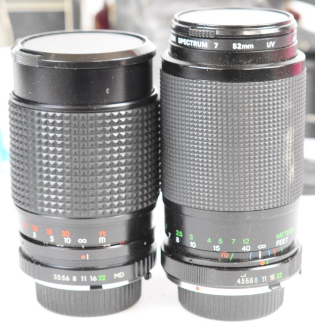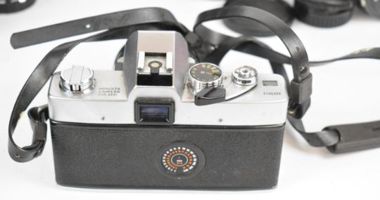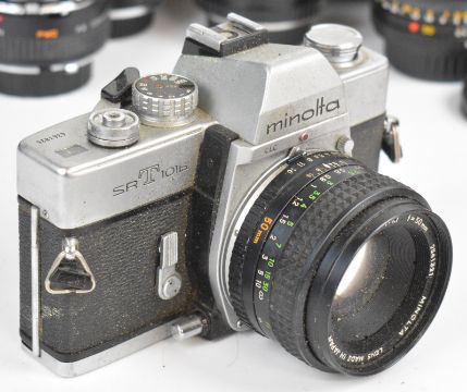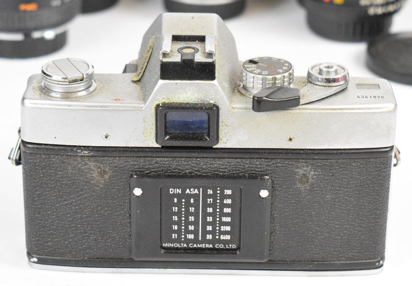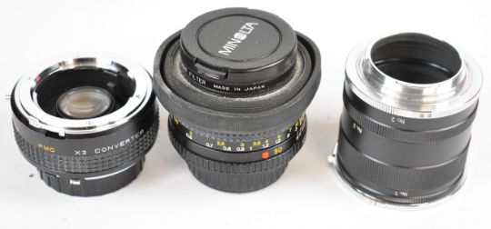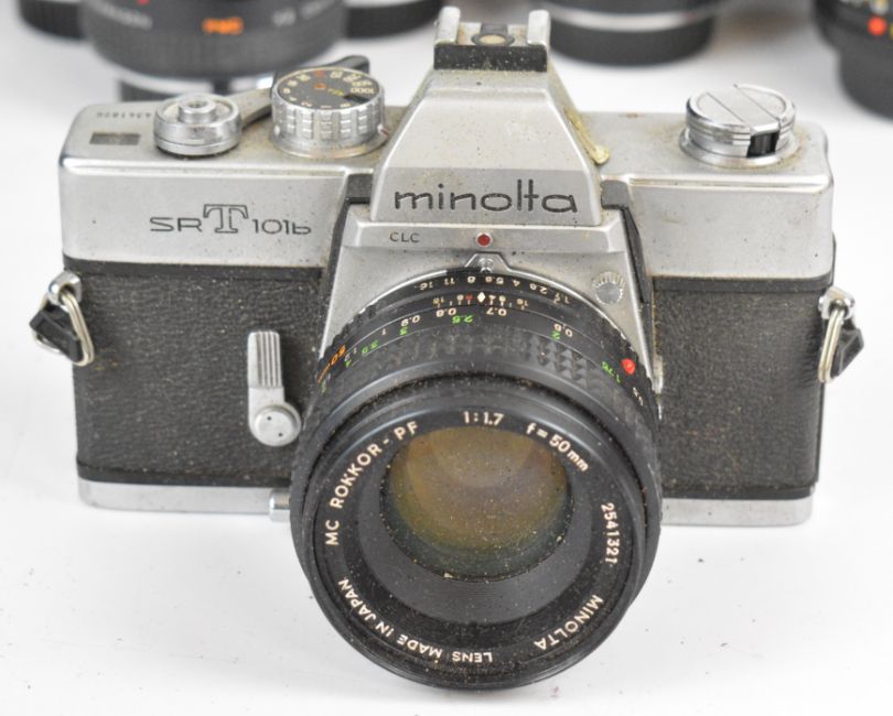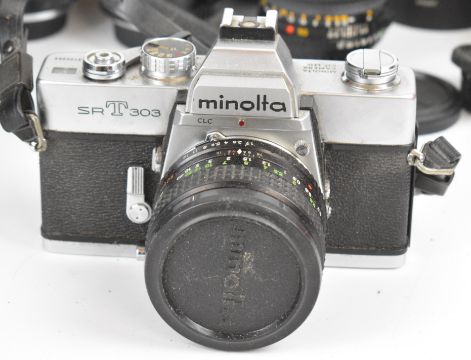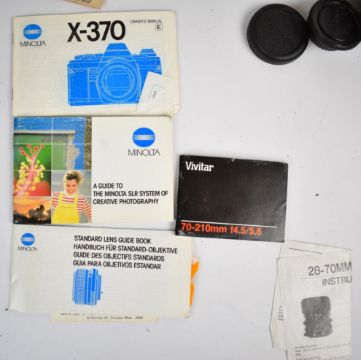 Four Minolta 35mm SLR cameras comprising X-300, X-370, SR-T 303 and SR-T 101b, with Minolta MC Rokkor-PF 1:1.7 f=50mm, MD 50mm 1:1.7, MC Rokkor-PF 1:1.7 f=50mm, MC zoom Rokkor 1:5.6 f=100-200mm, Miranda 35-135mm 1:3.5-4.5, MC Aetna-Rokunar 35-135mm 1:3.5/4.5, Vivitar 70-210mm 1:4.5-5.6 and Promaster 1:3.5-4.5 f=28-70mm lenses and various extension tubes and a x2 converter