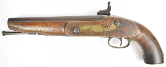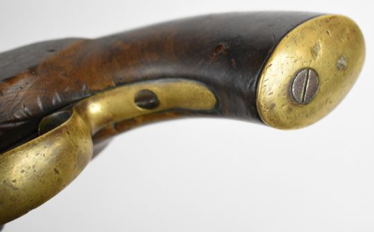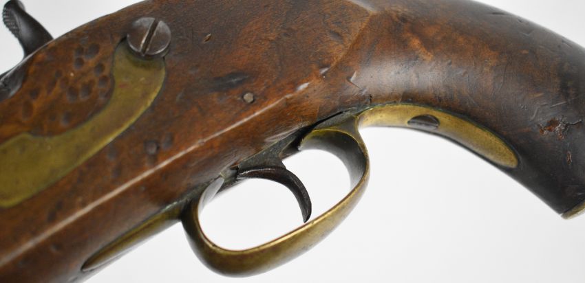 Enfield pattern 14 bore percussion hammer action pistol with line engraved lock and hammer, brass trigger guard, butt plate and mounts, steel ram-rod and 8.5 inch smooth bored barrel, overall length 38cm.