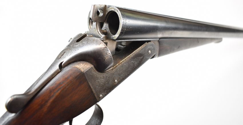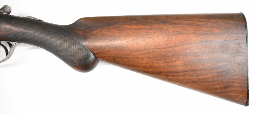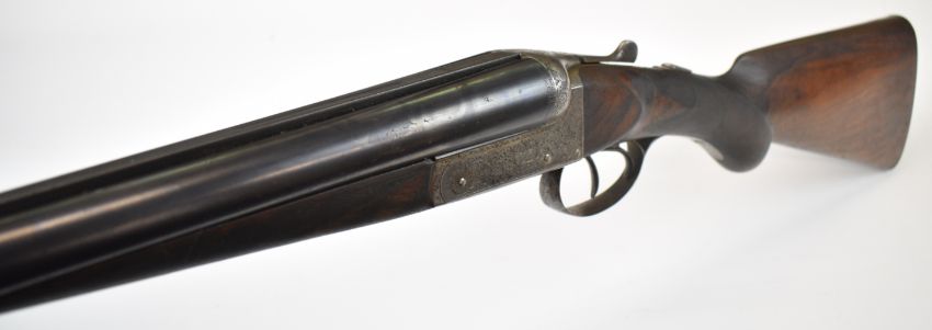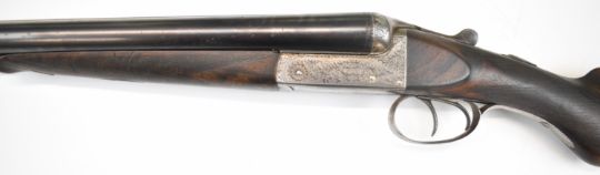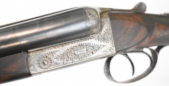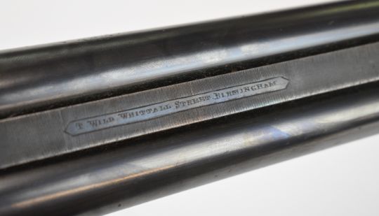 Thomas Wild 12 bore side by side shotgun with named locks and engraved locks, engraved underside, trigger guard, top plate, thumb lever and fences, chequered semi-pistol grip and horn tipped forend, double trigger and named 30 inch barrels choked ¾, overall length 117.5cm, length of pull 36cm, serial number 16542. PLEASE NOTE THAT A VALID RELEVANT SHOTGUN CERTIFICATE IS REQUIRED TO VIEW OR PURCHASE THIS LOT AND FOR ALL SHOTGUNS OR RIFLES PLEASE ENSURE YOU HAVE THE RELEVANT CERTIFICATE BEFORE BIDDING.