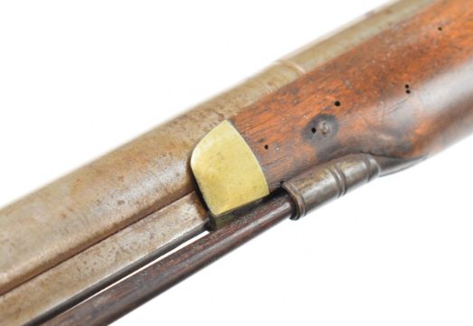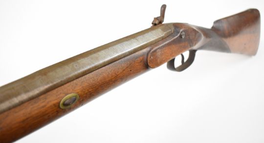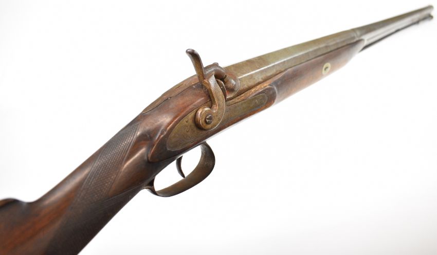 Indistinctly named 10 bore percussion hammer action sporting gun with engraved lock, hammer, trigger guard and top plate, chequered grip, vacant cartouche to the underside of the stock, brass tipped wooden ram-rod and named 36 inch part-octagonal smooth bored barrel, overall length 132cm.