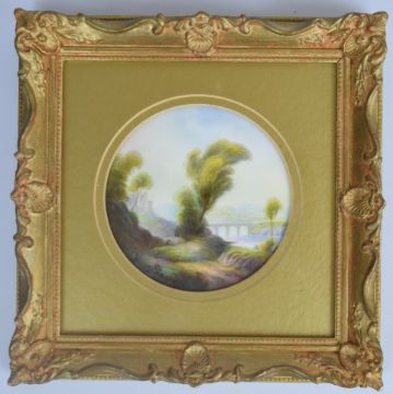 Raymond Rushton (1925-2006) for Royal Worcester circular hand decorated porcelain plaque of a windswept landscape with viaduct and ruins, signed lower left and with puce mark verso, diameter 11cm,