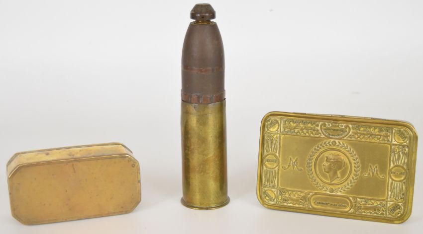 Shell cases and other military collectables comprising 105mm shell case dated 1969, 3 pounder blank round with inscription regarding the firing of the noonday gun 27th March 1986, two further shell cases, one German dated 1916, belt of machine gun cases, WW1 marching compass, 1945 Richards military cutlery set, resin training grenade, 1914 Christmas tin, bronze or brass octagonal box and a bronze or similar model of an anchor, height 14.5cm