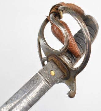 Bristol & Gloucestershire Artillery Corps George Gibbs Bristol Victorian dress sword, with wire bound shagreen grip the fullered blade having maker's name and etched for the Bristol & Gloucestershire Artillery Corps to one side and named to George Nattriss to other side, in steel scabbard, overall length 89cm. PLEASE NOTE: WE ARE NOT ABLE TO OFFER OUR USUAL POSTAGE SERVICE FOR THIS LOT