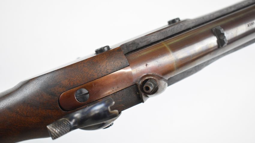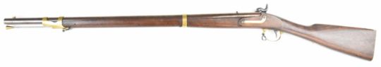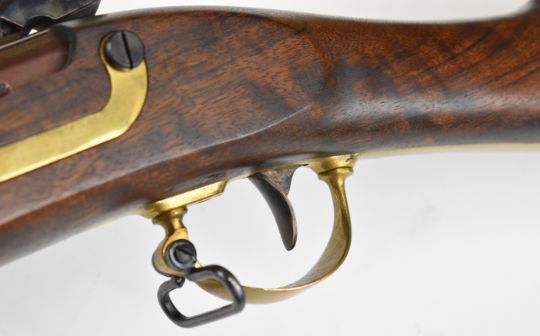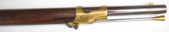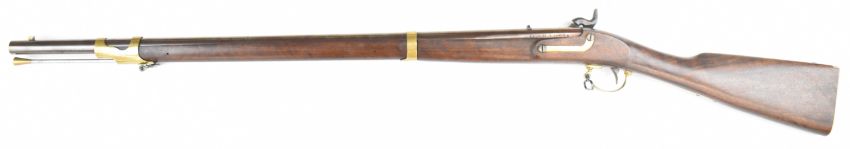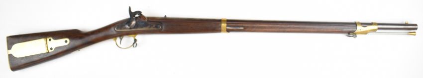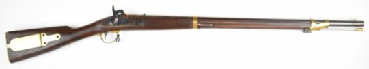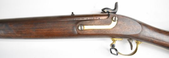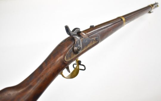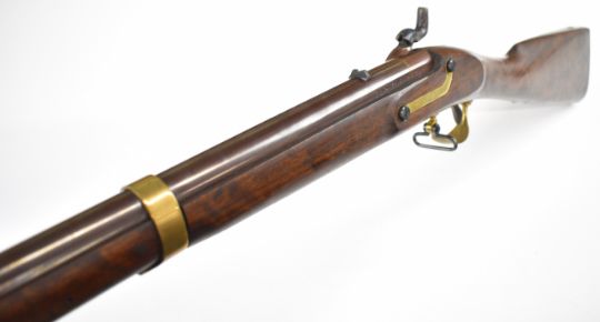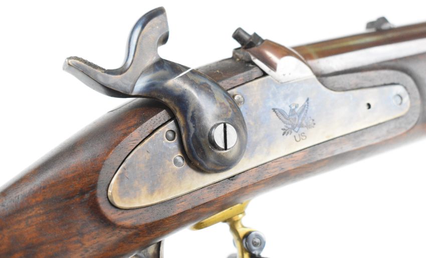 Italian .58 muzzle loading percussion hammer action rifle with eagle over 'US' engraved to the lock, brass trigger guard, butt plate and mounts, storage compartment to the stock, brass tipped steel ram-rod, fixed sights and 33 inch rifled barrel, overall length 124cm, serial number 14019 .PLEASE NOTE THAT A VALID RELEVANT FIREARMS CERTIFICATE IS REQUIRED TO VIEW OR PURCHASE THIS LOT AND FOR ALL SHOTGUNS OR RIFLES PLEASE ENSURE YOU HAVE THE RELEVANT CERTIFICATE BEFORE BIDDING.