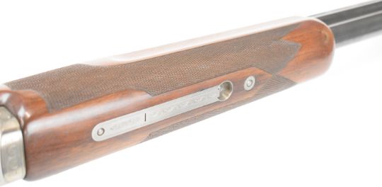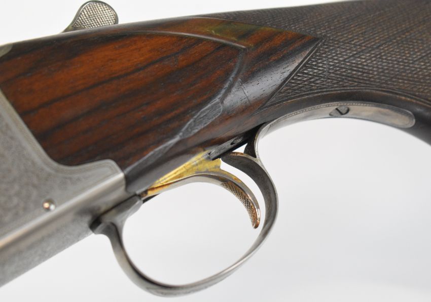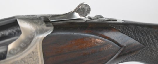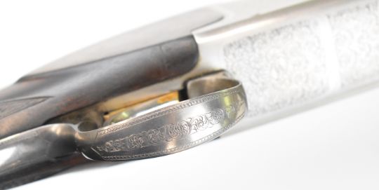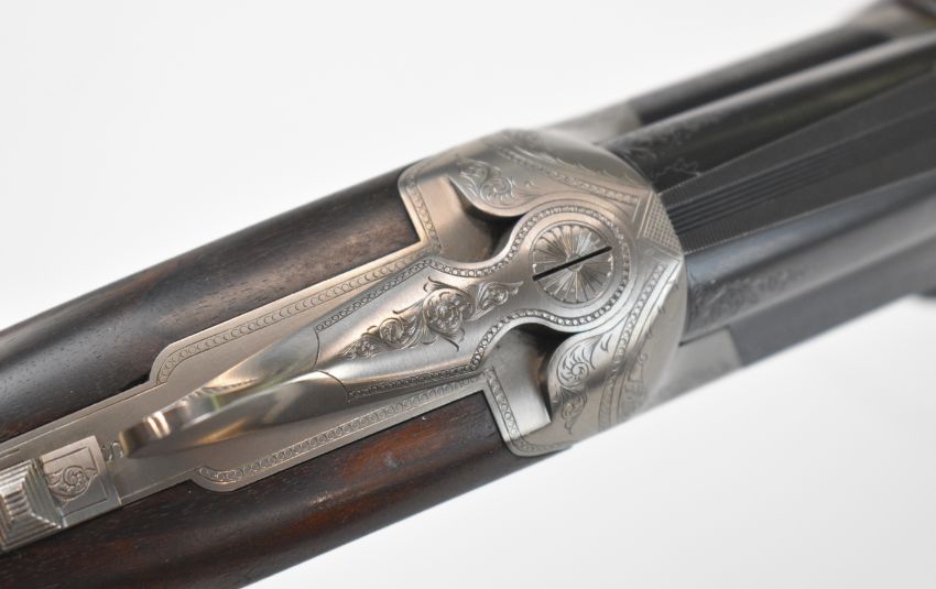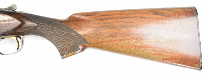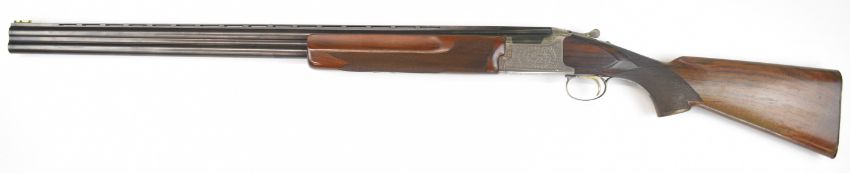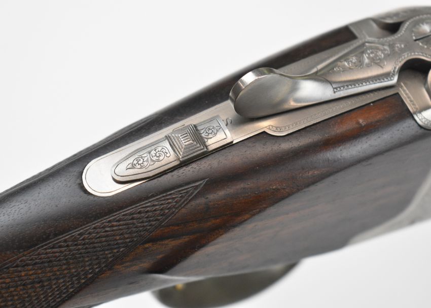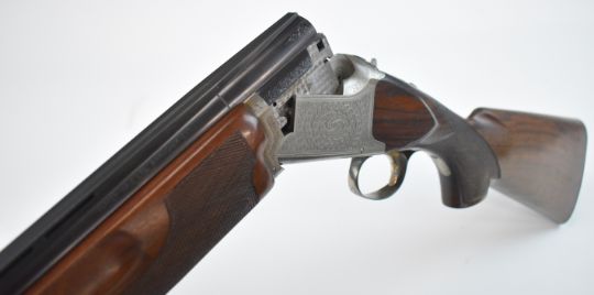 Parker-Hale 803 12 bore over and under ejector shotgun with engraved locks, trigger guard, underside, top plate and thumb lever, chequered semi-pistol grip and forend, single trigger, vented top rib and named 30 inch barrels choked ¼ and cylinder, overall length 118cm, length of pull 35cm, serial number K458622. PLEASE NOTE THAT A VALID RELEVANT SHOTGUN CERTIFICATE IS REQUIRED TO VIEW OR PURCHASE THIS LOT AND FOR ALL SHOTGUNS OR RIFLES PLEASE ENSURE YOU HAVE THE RELEVANT CERTIFICATE BEFORE BIDDING.