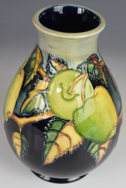 Moorcroft trial pedestal vase decorated with fruit, dated 99 to base, H19.5cm