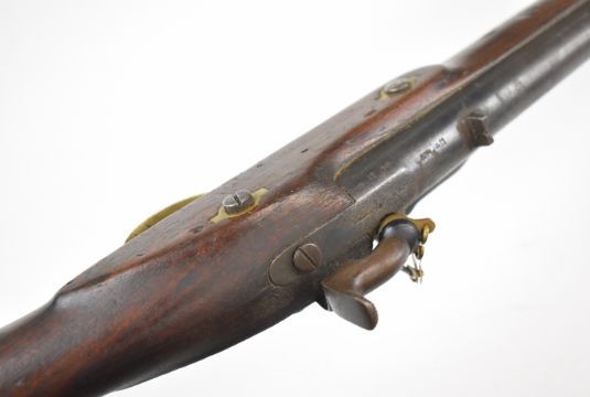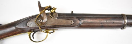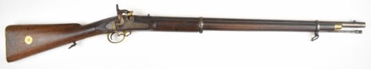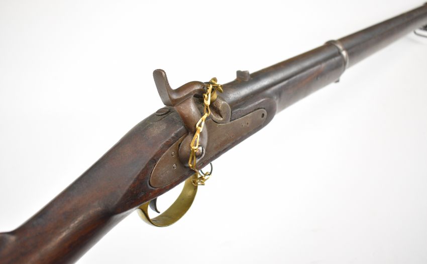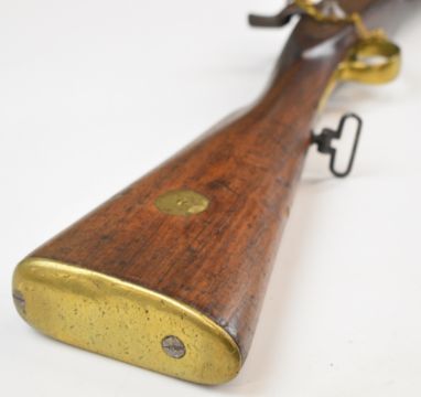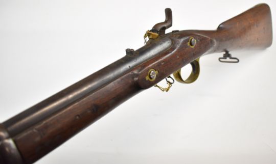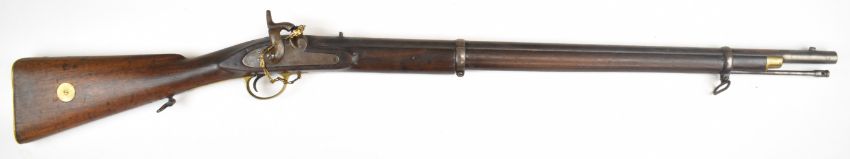 Enfield two band percussion hammer action gun with lock stamped with crown over 'VR' cypher and '1863 Enfield', fixed sights, brass trigger guard butt plate and mounts, steel ram-rod, sling mounts and 31.5 inch smooth bored barrel, overall length 121.5cm.