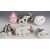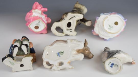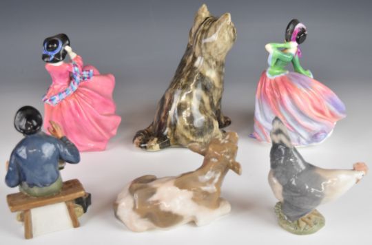 Copenhagen cow and chicken figures, Winstanley cat and three Royal Doulton figures, tallest 22cm