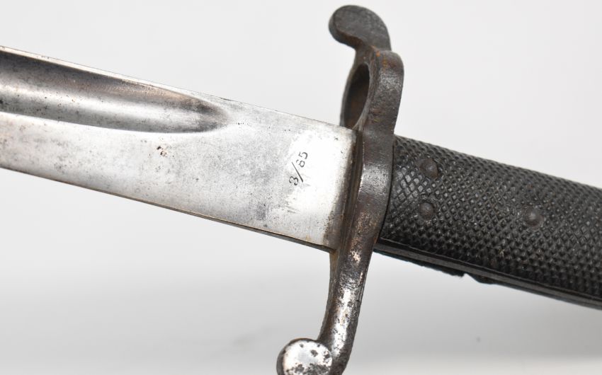 British 1856 pattern yataghan sword bayonet, dated 3/85 in scabbard leather and steel, overall length 74cm and a likely American fighting knife, overall length 27cm. PLEASE NOTE: WE ARE NOT ABLE TO OFFER OUR USUAL POSTAGE SERVICE FOR THIS LOT