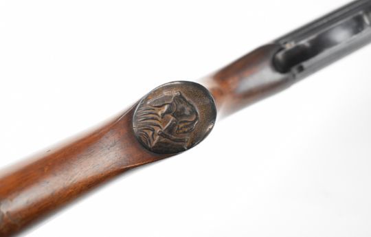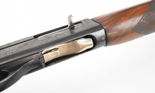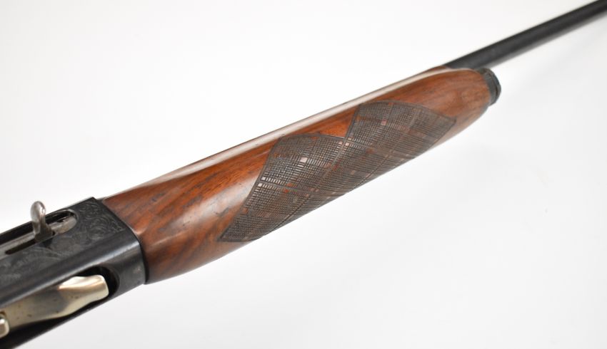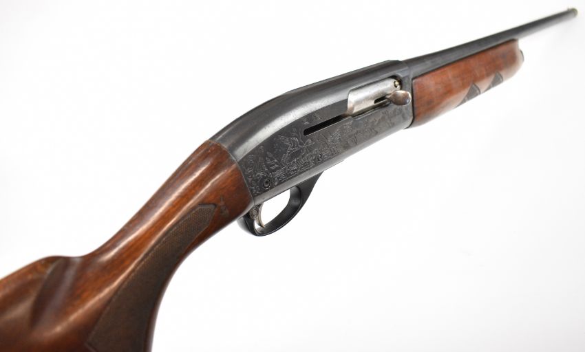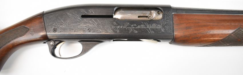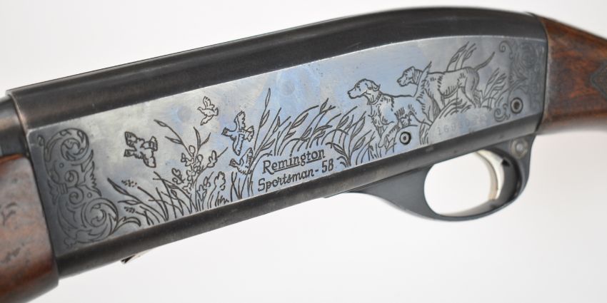 Remington Sportsman 58 16 bore 3-shot semi-automatic shotgun with engraved scenes of dogs and birds to the action, chequered semi-pistol grip and forend and 24.5 inch multi-choke barrel, overall length 114.5cm, length of pull 35.5cm, serial number 169308W. PLEASE NOTE THAT A VALID RELEVANT SHOTGUN CERTIFICATE IS REQUIRED TO VIEW OR PURCHASE THIS LOT AND FOR ALL SHOTGUNS OR RIFLES PLEASE ENSURE YOU HAVE THE RELEVANT CERTIFICATE BEFORE BIDDING.