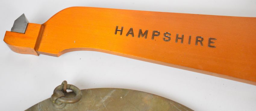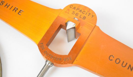 Hampshire County Council De Grave & Co. Ltd. Victorian 56lb beam scale with maker's name and local authority names to beam and also with verification marks from VR 1901 to EIIR 1961, supported on a wooden tripod with brass pans, width of beam 63cm