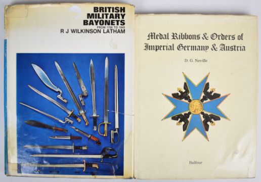 German, British and other military interest reference books comprising German Army Helmets and Insignia by Didier Laine, German Belt Buckles by Thomas Reid, Medal Ribbons & Orders of Imperial Germany and Austria by D.G.Neville, Helmets and Body Armour in Modern Warfare by Bashford Dean and two copies of British Military Bayonets by R.J.Wilkinson Latham