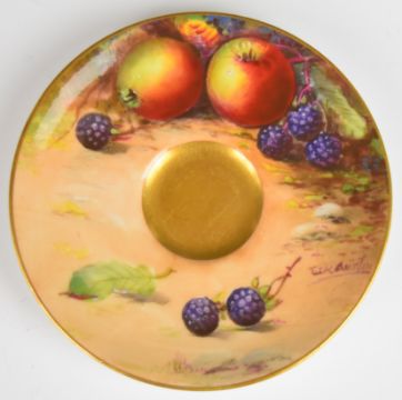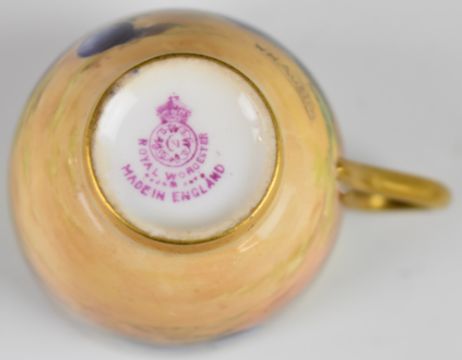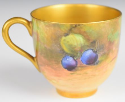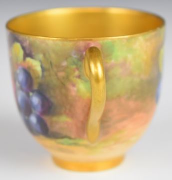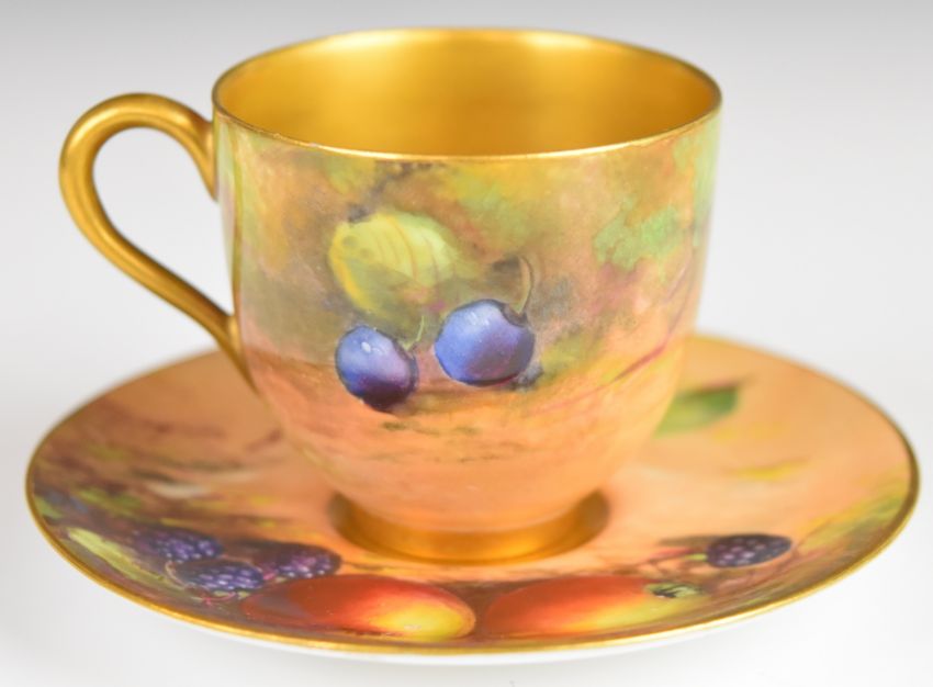 Royal Worcester painted fruit cabinet cup and saucer with decoration of apples, peaches, grapes and blackberries and gilt wash interior, signed Austin, H5cm