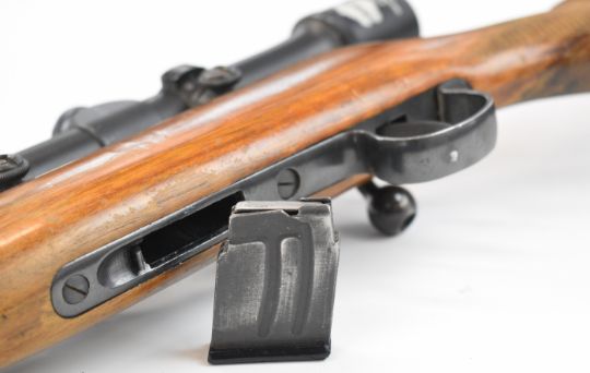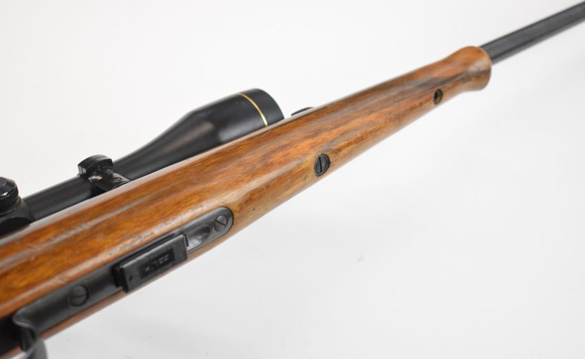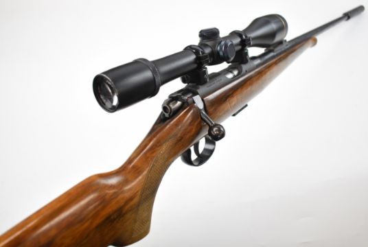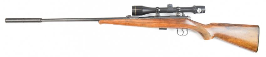 BRNO Model 2 .22 bolt-action rifle with chequered semi-pistol grip, multi-shot magazine, Leslie Hewett 4x40 scope, sound moderator and 28 inch barrel, overall length 118cm, serial number 288692. PLEASE NOTE THAT A VALID RELEVANT FIREARMS CERTIFICATE IS REQUIRED TO VIEW OR PURCHASE THIS LOT AND FOR ALL SHOTGUNS OR RIFLES PLEASE ENSURE YOU HAVE THE RELEVANT CERTIFICATE BEFORE BIDDING.