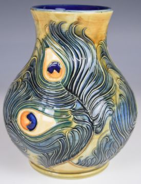 Moorcroft pedestal vase decorated with feathers in the Phoenix pattern, dated 99 to base, H16cm