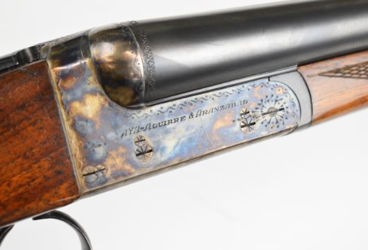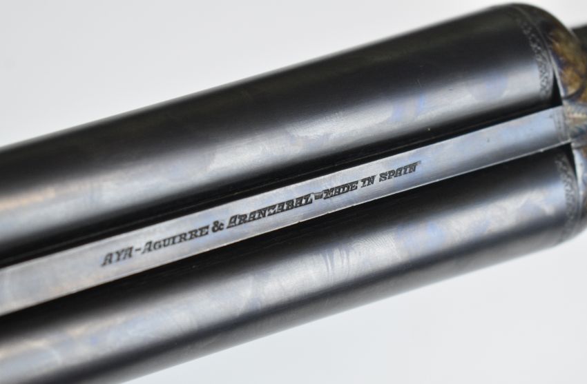 AYA No 3 12 bore side by side shotgun with named and border engraved locks, border engraved underside trigger guard, top plate, thumb lever and fences, chequered grip and forend, double trigger and named 26 inch barrels choked ¼ and ¾, overall length 109.5cm, length of pull 37.5cm, serial number 528047. PLEASE NOTE THAT A VALID RELEVANT SHOTGUN CERTIFICATE IS REQUIRED TO VIEW OR PURCHASE THIS LOT AND FOR ALL SHOTGUNS OR RIFLES PLEASE ENSURE YOU HAVE THE RELEVANT CERTIFICATE BEFORE BIDDING.