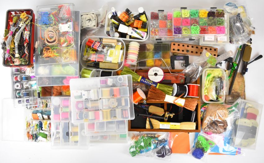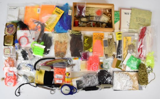 Very large collection of fly fishing / fly tying equipment and accessories including vices, tools, hooks (mainly Kamasan), capes, threads wires, beads etc, many items in original packaging and unopened