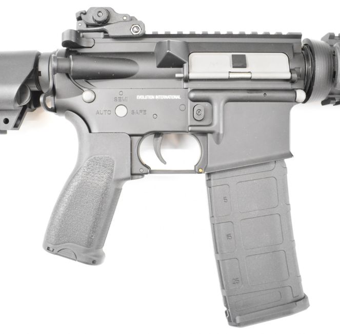Evolution Recon 6mm COairsoft rifle with textured pistol grip, composite tactical stock, multi-shot magazine, adjustable sights and scope rail, serial number 022278, in original box with instruction manual and accessories. PLEASE NOTE IF YOU REQUIRE POSTAGE ALL POST 1939 AIR GUNS CAN ONLY BE SENT TO AN RFD.