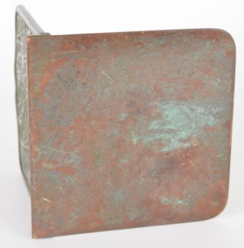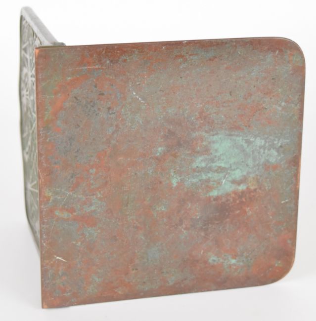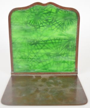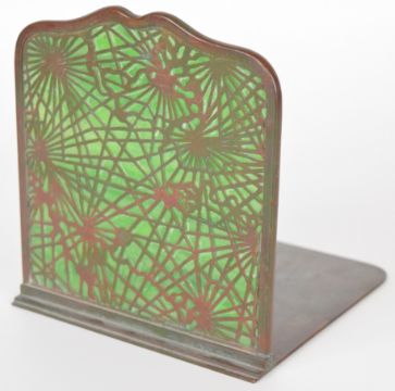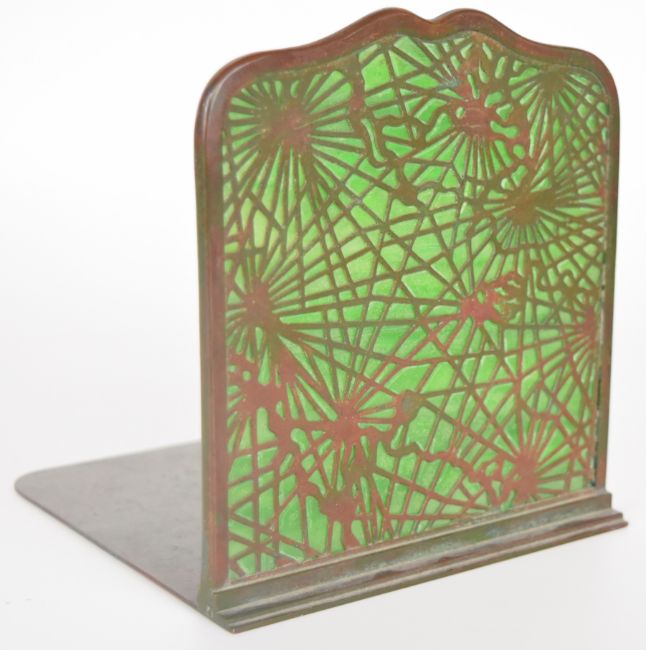 Tiffany Studios New York bronze and glass bookend with pierced decoration over glass panel (14 x 15cm), named and stamped 1024 to the base.
