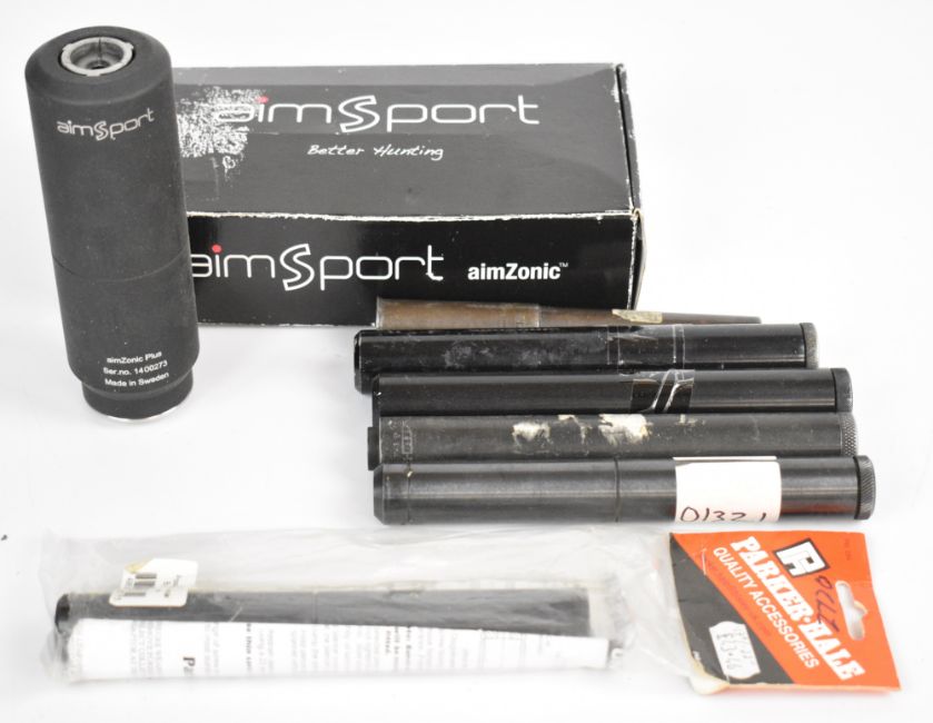 Six rifle or air rifle sound moderators including AimSport AimZonic in original box, Parker-Hale etc together with a Bisley 12 bore to .410 shotgun conversion sleeve. PLEASE NOTE THAT A VALID RELEVANT FIREARMS CERTIFICATE IS REQUIRED TO VIEW OR PURCHASE THIS LOT AND FOR ALL SHOTGUNS OR RIFLES PLEASE ENSURE YOU HAVE THE RELEVANT CERTIFICATE BEFORE BIDDING.