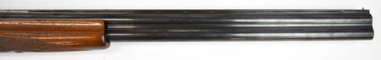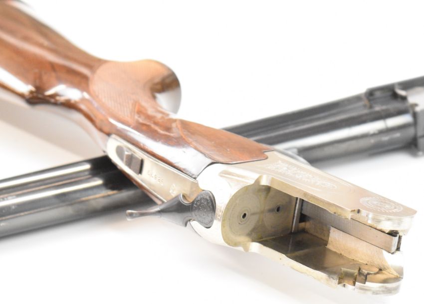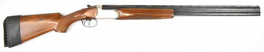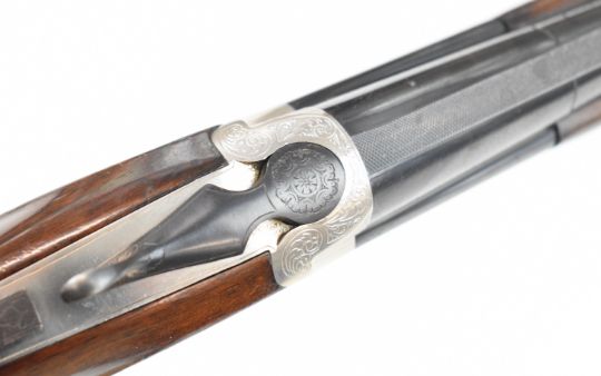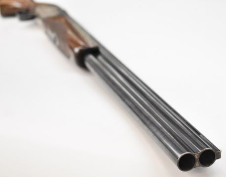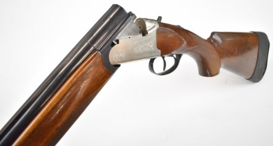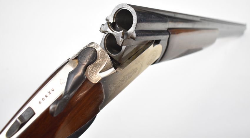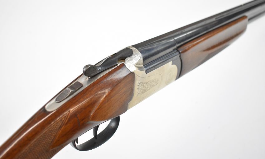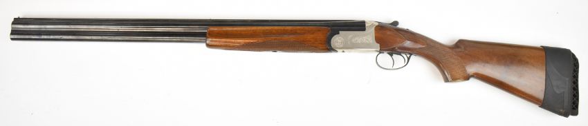 Italian 12 bore over and under shotgun with engraved locks, underside and thumb lever, chequered semi-pistol grip and forend, double trigger, vented top rib and 27.75 inch barrels choked ¾ and full, overall length 114cm, length of pull 38cm, serial number 52599. PLEASE NOTE THAT A VALID RELEVANT SHOTGUN CERTIFICATE IS REQUIRED TO VIEW OR PURCHASE THIS LOT AND FOR ALL SHOTGUNS OR RIFLES PLEASE ENSURE YOU HAVE THE RELEVANT CERTIFICATE BEFORE BIDDING.
