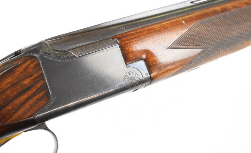 Browning B25 A1 12 bore over and under ejector shotgun with chequered semi-pistol grip and forend, single trigger, vented top rib and 27.5 inch barrels choked ¼ and ½, overall length 114cm, length of pull 36.5cm, serial number 63229 S77. PLEASE NOTE THAT A VALID RELEVANT SHOTGUN CERTIFICATE IS REQUIRED TO VIEW OR PURCHASE THIS LOT AND FOR ALL SHOTGUNS OR RIFLES PLEASE ENSURE YOU HAVE THE RELEVANT CERTIFICATE BEFORE BIDDING.