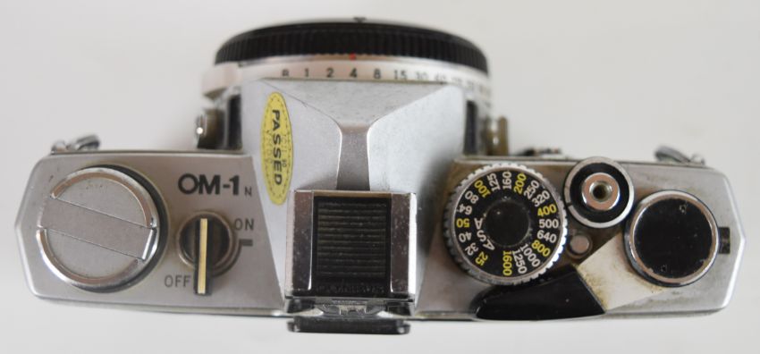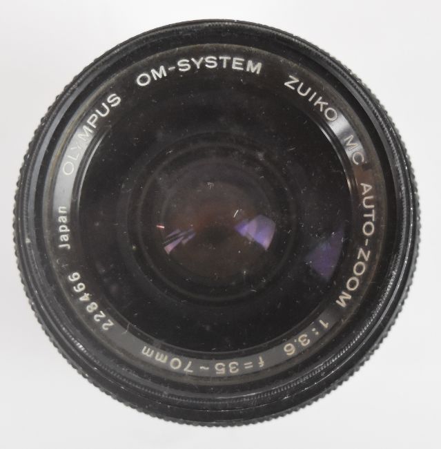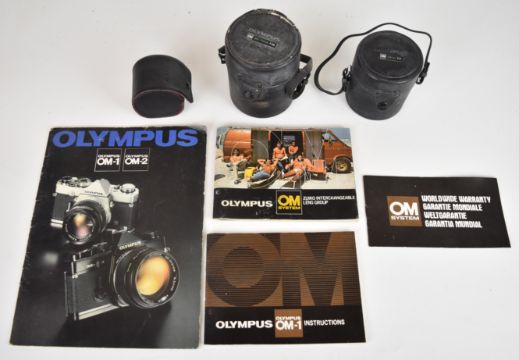 Olympus OM-1N 35mm SLR camera, with Olympus Zuiko MC auto-2 1:2 f=28mm, auto-zoom 1:3.6 f=35-70mm and auto-zoom 1:5 f=85-250mm lenses, Soligor teleconverter, various manuals etc